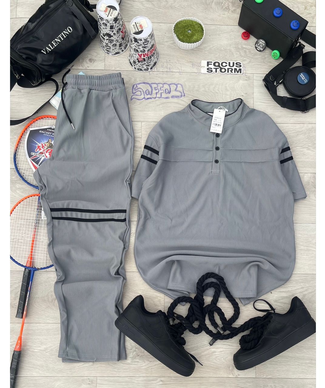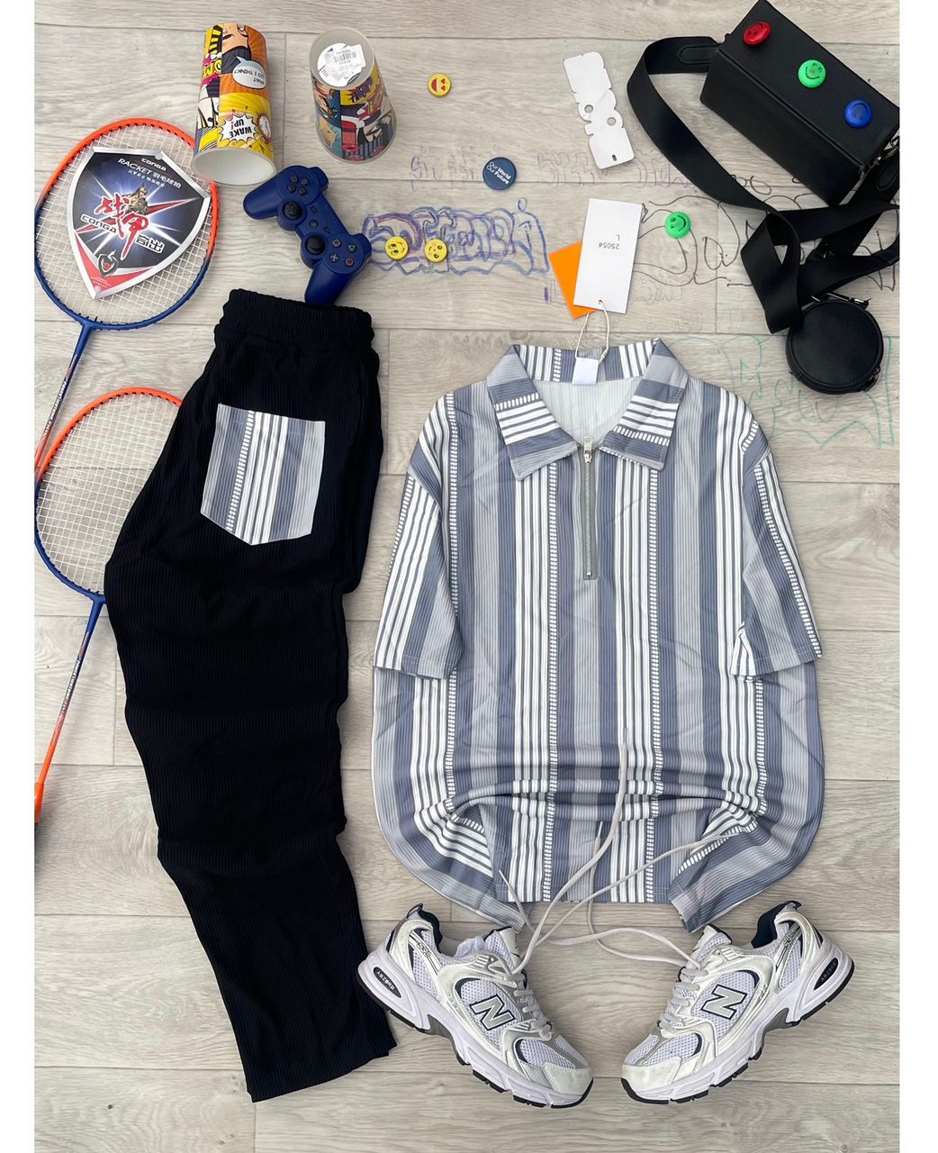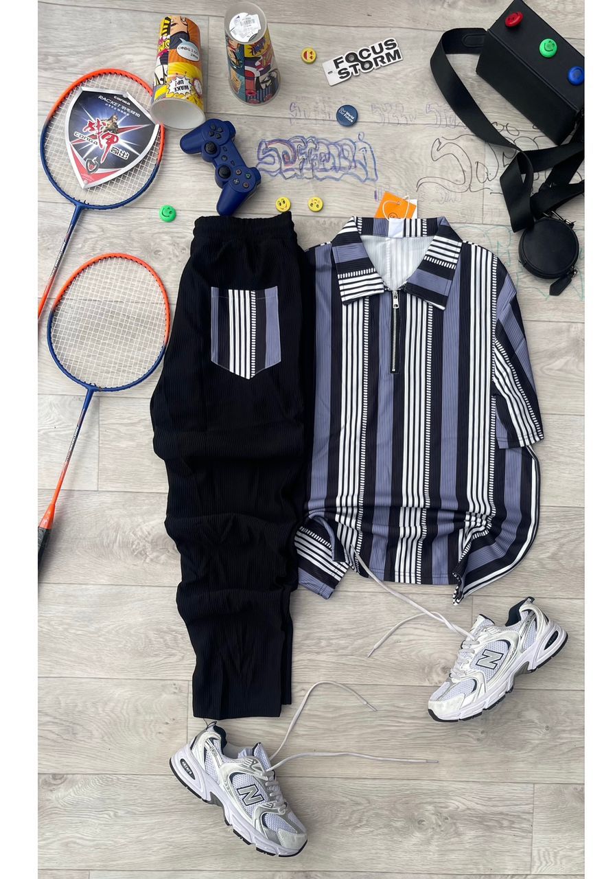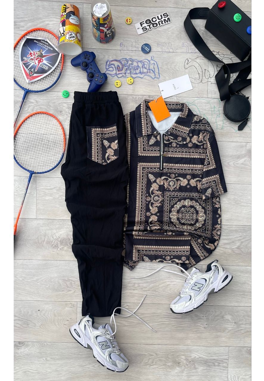 Découvrez cet ensemble moderne pour homme comprenant une chemise à col zippé avec motif bandana élégant et un pantalon noir côtelé confortable. Parfait pour un look décontracté et stylé.