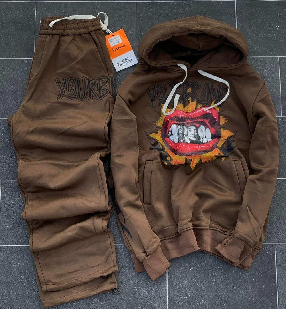Affirmez votre style avec notre ensemble jogging et hoodie marron, un incontournable pour les amateurs de streetwear. Ce survêtement présente un design graphique percutant avec une bouche aux lèvres rouges et des flammes, et l'inscription "YOUR BRAND" pour une touche unique. Fabriqué dans un tissu doux et confortable, il est idéal pour un look décontracté et branché. Le hoodie est doté d'une capuche et d'une poche kangourou, tandis que le pantalon offre une coupe décontractée avec des chevilles ajustées. Parfait pour se démarquer en toute occasion !
